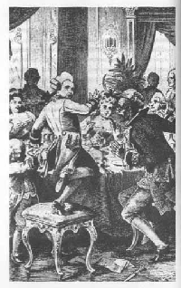 Важный полный сановник, которого лакеи называли "его превосходительством, господином обергофмейстером двора", снова ударил своим жезлом об пол, и лакеи стали обносить обедавших различного рода кушаньями. В первую очередь подали всевозможные пироги и караваи. Нарядные кавалеры и дамы осторожно накладывали себе на тарелки дымящийся курник, расстегаи с дичью, подовые лепешки с начинкою и самым изящным образом, при помощи ножа и вилки, разрезали их и осторожно отправляли в рот. Каково же было их удивление, когда дошла очередь до Мартына и тот, нисколько не стесняясь, схватил с блюда прямо руками огромный кусок жирного пирога с начинкой и тяжело плюхнул его себе на тарелку, потом снова запустил руку в оставшиеся на блюде пироги, стащил другой кусок на тарелку к брату!