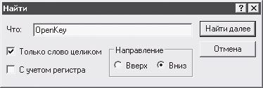В данном окне в поле Что вводится текст для поиска. Установив флажки Только слово целиком и С учетом регистра, вы включите дополнительные параметры поиска. Переключатель Направление определяет направление поиска: к началу списка (Вверх) или к концу (Вниз). Поиск запускается нажатием кнопки Найти далее.