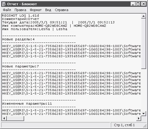 Первая строка отчета содержит информацию о названии и версии программы Regshot.