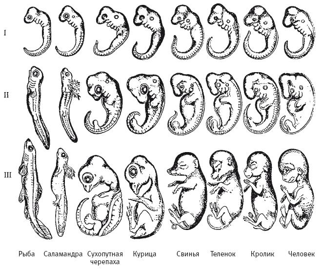Выводы фон Бэра о сходстве ранних фаз эмбрионального развития у разных видов привлекли внимание Дарвина. Работа фон Бэра была опубликована в 1828 году, а Дарвин узнал о ней три года спустя, когда уходил на судне королевского флота “Бигль” в изменившее мир кругосветное путешествие. Когда через 30 лет он опубликовал книгу “О происхождении видов”, он представлял эмбрионы в качестве доказательства своей эволюционной теории. Тот факт, что столь разные существа, как рыбы, лягушки и люди, имеют общее начало, для Дарвина свидетельствовал об общности их истории. Что могло лучше доказать единство происхождения разных видов, чем сходство эмбриональных стадий развития?