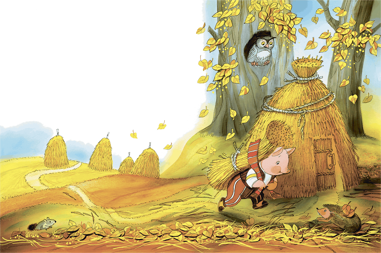 Ниф-Ниф решил, что проще и скорее всего смастерить дом из соломы. Ни с кем не посоветовавшись, он так и сделал. Уже к вечеру его хижина была готова.