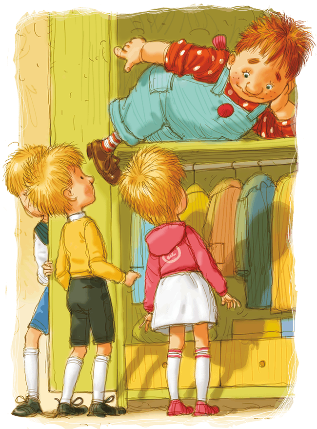 Кристер подскочил к ней и тоже заглянул в шкаф. Вначале они ничего не заметили, кроме висящей одежды, но потом с верхней полки раздалось хихиканье. Кристер и Гунилла посмотрели наверх и увидели на полке маленького толстого человечка. Удобно примостившись, он лежал, подперев рукой голову, и покачивал правой ножкой. Его весёлые голубые глаза сияли.
