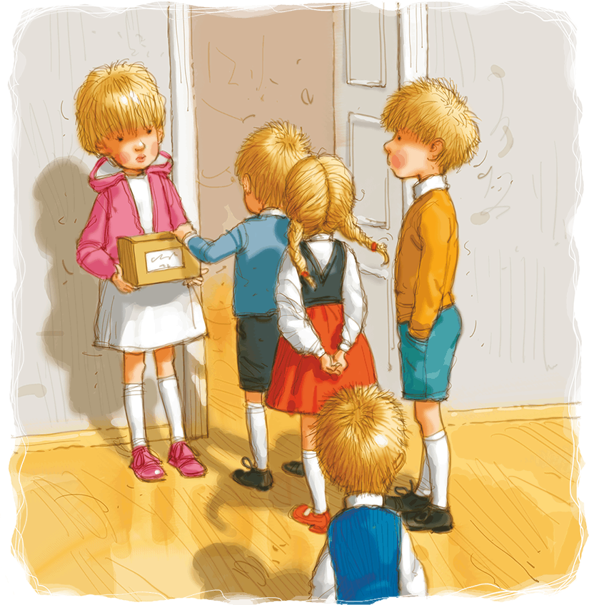 У двери в комнату Малыша стояла Гунилла; она отбирала у всех зрителей конфеты и клала их в коробку с надписью: «Для благотворительных целей».