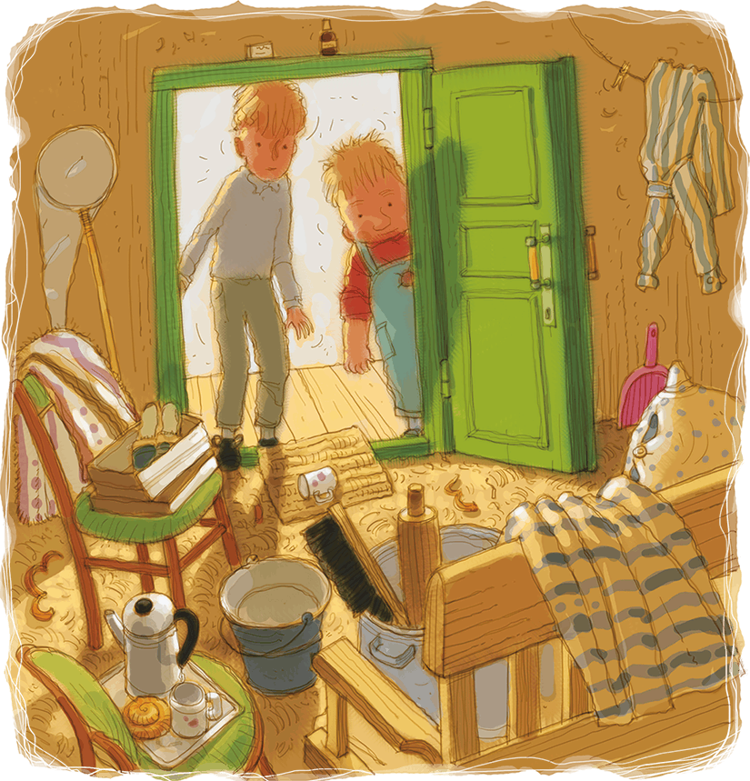– Глухая тетеря! Я говорю, что несправедливо, чтобы я один работал до седьмого пота! Гляди, я скоро набью себе мозоли на ладошках! Я из кожи лезу вон, чтобы почище убрать твою комнату. Теперь ты должен полететь со мной и помочь мне убрать мою, а то будет несправедливо.
