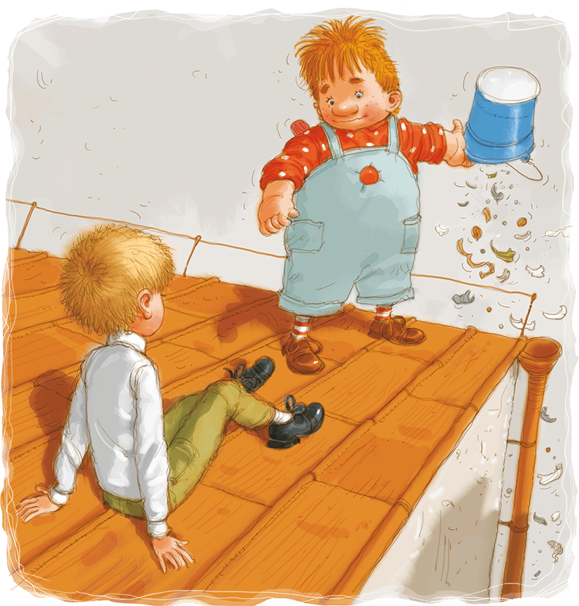 Схватив ведро, он помчался вниз по крутому скату крыши. Малыш испугался, подумав, что Карлсон не сумеет остановиться, когда добежит до края.