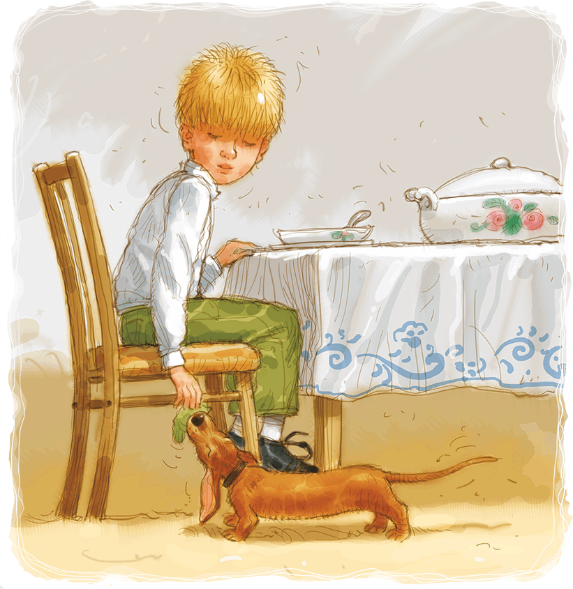 Наконец собралась вся семья, и тогда мама позвала всех обедать; все вместе сели за стол: и мама, и папа, и Боссе, и Бетан, и Малыш. На обед были голубцы – опять капуста! А Малыш любил только то, что не полезно. Но под столом у его ног лежал Бимбо, который ел всё без разбору. Малыш развернул голубец, скомкал капустный лист и тихонько швырнул его на пол, для Бимбо.