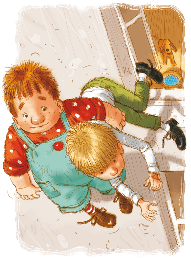 Но Карлсон всё же заставил Малыша лечь на ступеньку и как следует побрызгал ему в лицо какао.