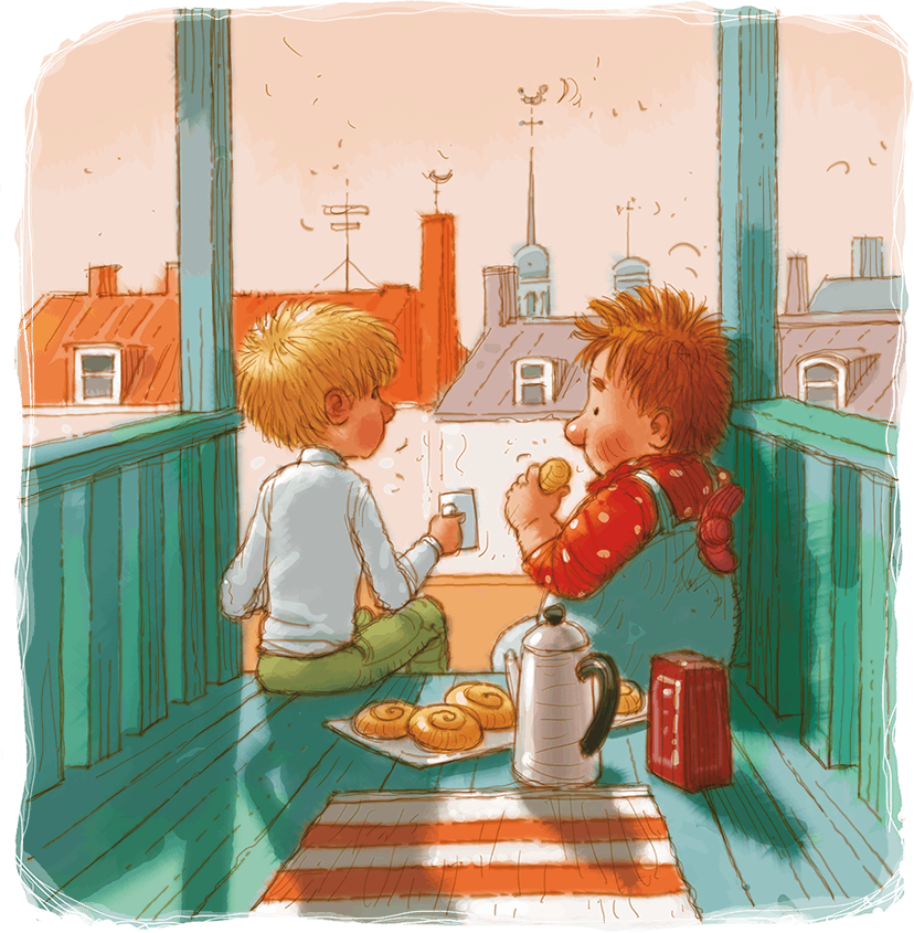 Карлсон быстро справился со своими семью плюшками. У Малыша дело продвигалось куда медленнее. Он ел ещё только вторую, а третья лежала возле него на ступеньке.