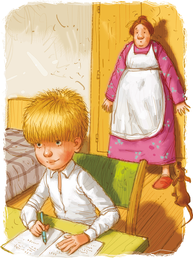 Малыш увидел свою комнату, увидел, как ему показалось, чётче, чем если бы он в ней был. Вот Бимбо – он спит в корзине, а вот его, Малышова, кровать, а вот стол, за которым он делает уроки, а вот часы на стене. Они показывают ровно три. Но фрёкен Бок что-то не видно.