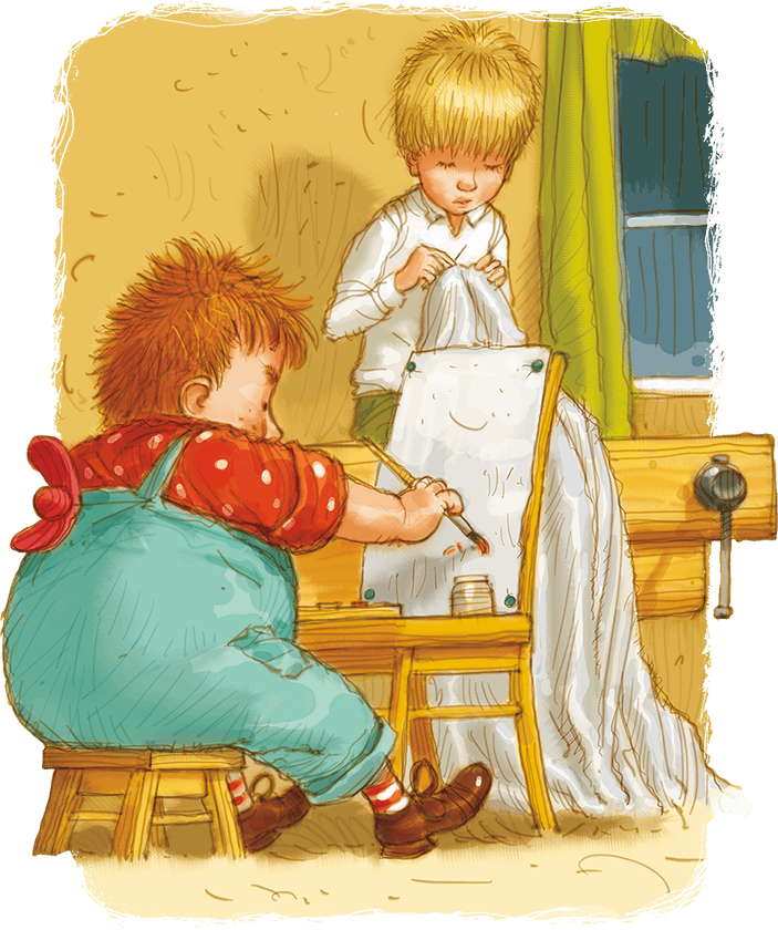 И Малышу ничего не оставалось, как сесть на верстак, согнув спину и поджав ноги, словно заправский портной, и шить, в то время как Карлсон, забившись в угол, рисовал свою картину.