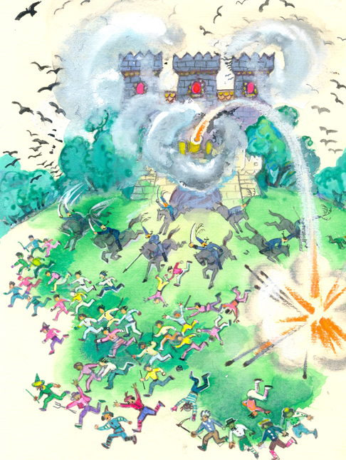 Доктор Гаспар подумал, что всё это похоже на картинку волшебного фонаря. Солнце ярко светило, блестела зелень. Бомбы разрывались, как кусочки ваты; пламя появлялось на одну секунду, как будто кто-то пускал в толпу солнечных зайчиков. Лошади гарцевали, поднимались на дыбы и вертелись волчком. Парк и Дворец Трёх Толстяков заволокло белым прозрачным дымом.