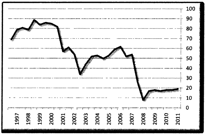 Как видно из графика, начиная с пика в конце 1990-х годов, количество американцев, позитивно оценивающих текущую экономическую ситуацию в стране, сократилось к 2009 г. почти в 5 раз. При этом количество респондентов CNN, оценивающих ее как «очень хорошую», сократилось более чем в 40 раз, с 42% в марте 2000 г. до 1% с начала 2009 г., и с тех пор не менялось{1354}.