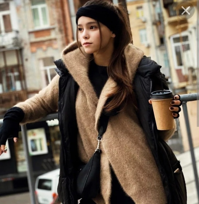 Стильная войлочная кофта, сверху дутая безрукавка. Беспалые черные перчатки и большие наушники на голове. Тоже черные. В руке - большой стакан кофе. Губы двигаются беззвучно подпевая...
