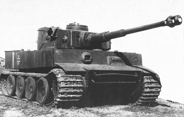 Первый из «тигров», захваченных Красной Армией, на НИБТПолигоне в Кубинке. Скобы на нижнем лобовом листе корпуса предназначены для запасных траков; на двух скобах на правом борту башни крепился ящик для снаряжения. На лобовом листе подбашенной коробки слева изображение слона — эмблемы 502-го тяжёлого танкового батальона, справа — приварена подкова, видимо, «на счастье»…