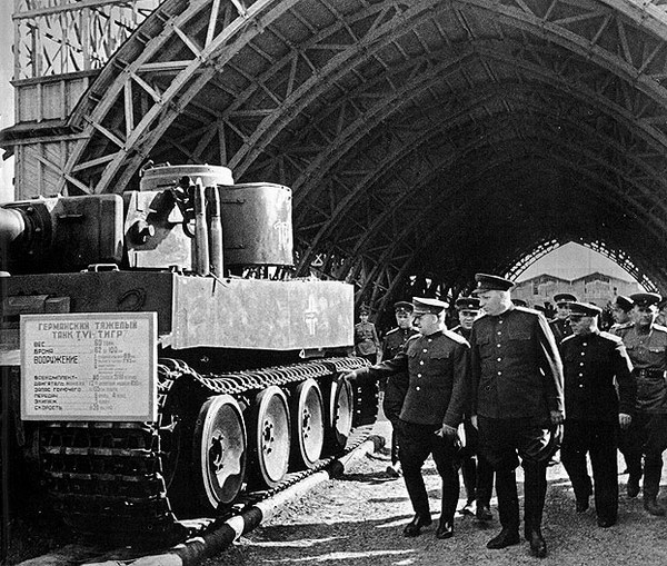 Г. К. Жуков, Н. Н. Воронов и К. Е. Ворошилов осматривают первый захваченный «Тигр» ни выставке трофейного вооружения в ЦПКиО имени Горького, Москва, лето 1943 года. Обращает на себя внимание необычное крепление ящика для снаряжения на борту башни, впоследствии никогда не встречавшееся.