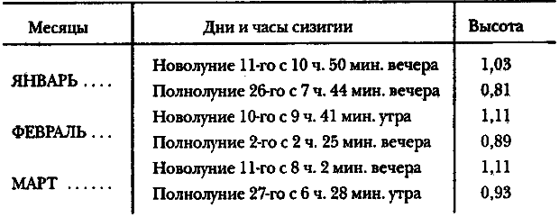 Было отмечено, что в наших портах наиболее сильные приливы часто происходят через полтора дня после ново- и полнолуния. Таким образом, мы можем узнать день их наступления, прибавляя полтора дня к дате сизигий. Из таблицы видно, что в 1899 году (январь-февраль-март) наиболее сильные приливы ожидаются 13 января, 11 февраля и 13 марта. Эти приливы, в особенности 11 февраля и 13 марта, могут причинить некоторый ущерб, если будут сопровождаться ветром.