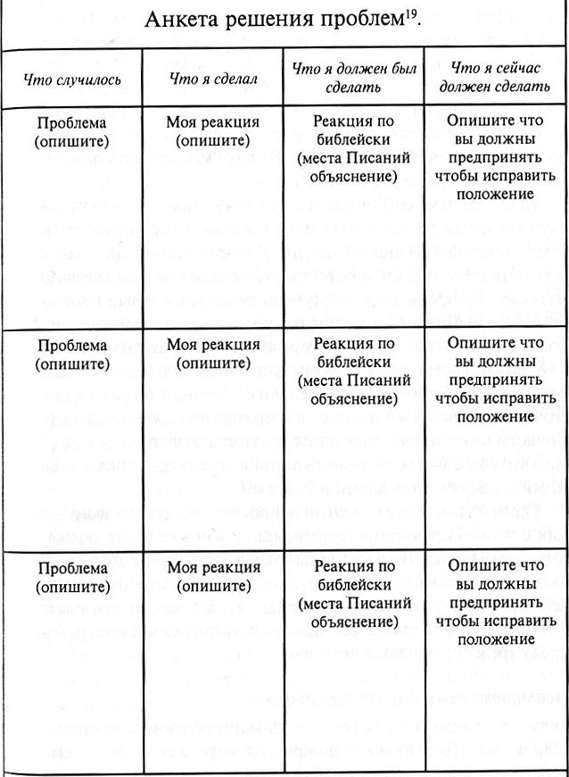 В главе «Сбор данных» мы уже рассмотрели анкету «Обнаружение проблем». Можно посоветовать использовать обе эти анкеты в течение недели для выявления греховных навыков. Помните также о необходимости составления списков и расписаний. Это немногие из тех методов, которые применяются в душепопечении.