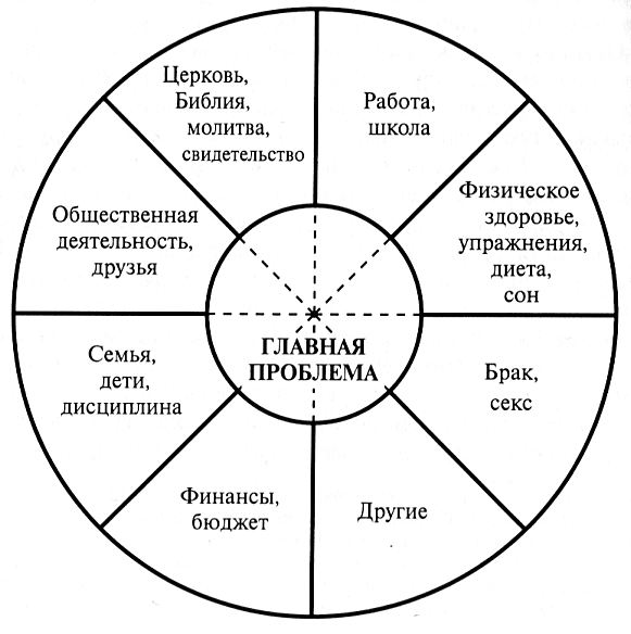 ПОЛНОЕ ПРЕОБРАЗОВАНИЕ ЖИЗНИ предполагает решение главной проблемы с учетом ее взаимодействия со всеми другими областями жизни. Главная проблема влияет на все области, и до тех пор, пока они не будут упорядочены в соответствии с Божьими принципами, пунктирные линии не исчезнут, и проблема не будет решена. Данную схему можно считать условной.
