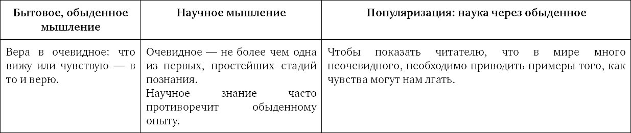 По той же самой причине так труден путь популяризации науки: нужно делать доступными концепции и гипотезы, полученные с применением научных принципов. Да, научные знания сложны и порой контринтуитивны – тем важнее переводить их на обыденный язык. А для этого необходимо знать и использовать правила бытового мышления.
