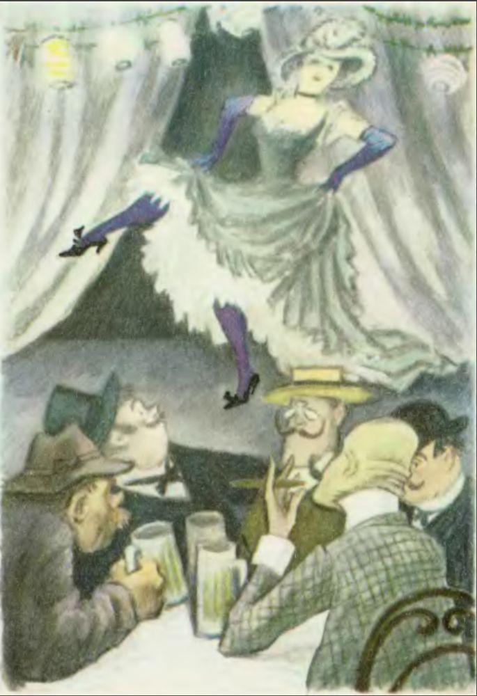 Гнус думал: «Опять, значит, в свою очередь…» Но сердце его грустило и млело. Он подкрался к двери и стал смотреть, как медленно ложатся и вновь расходятся зеленые складки на платье артистки Фрелих… Она откинула голову назад, в поле зрения Гнуса появилась изогнутая диадема на рыжих локонах и пестрая щека под высоко заломленной черной бровью. За одним из передних столиков восхищенный голос, голос широкоплечего крестьянина в синей шерстяной куртке, произнес: