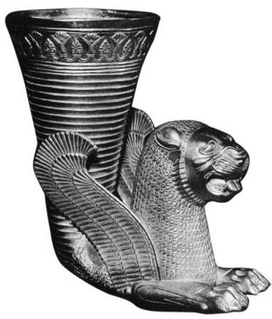 Эламский глиняный расписной кубок (высота 28 см). Около V–IV тысячелетий до н. э. ( слева); золотой ритон. IV–III вв. до н. э.