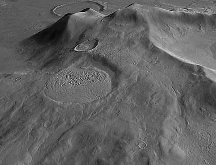 Вода активно поступала из недр планеты, поскольку Марс переживал бурную эпоху вулканизма, несопоставимого с земным. В северном полушарии Красной планеты до сих пор сохранились широкие равнины, залитые лавой, и две вулканические области – Фарсида и Элизий. Фарсида представляет собой высокое, поднимающееся до 10 км вулканическое плато протяженностью до 2000 км. Это плато украшают четыре крупных вулкана. В центральной области – горы Арсия, Павлина и Аскрийская. А на краю Фарсиды – гора Олимп, которая является высочайшим вулканом Марса и всей Солнечной системы. Высота Олимпа составляет 27 км по отношению к основанию и 25 км по отношению к среднему уровню марсианской поверхности. Великан окружен обрывами, достигающими высоты 7 км.