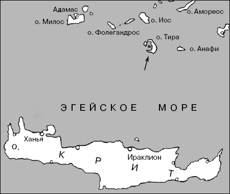 Причины глубокого упадка великолепной минойской культуры во второй половине II тысячелетия до н. э. окончательно не ясны. По всей видимости, талассократии Крита нанес смертельный удар природный катаклизм чудовищной силы – извержение вулкана на острове Санторин. Вообще-то Санторин – не отдельный остров, а небольшой архипелаг, лежащий на отшибе Кикладской островной дуги, протянувшейся на юго-восток от аттического острия Балканского полуострова. Он состоит из кривой подковы острова Тира (Тера, или Фера, в других транслитерациях) и нескольких мизерных клочков суши, расположившихся по соседству. Геологи свидетельствуют, что беспокойный вулкан на острове Санторин неоднократно пробуждался к активности в течение последних 100 тысяч лет, но извержение, приключившееся в середине II тысячелетия до н. э., было одним из самых катастрофических. Взрыв в 1883 году знаменитого вулкана Кракатау в Зондском проливе, выбросивший миллионы тонн грунта на высоту 70–80 километров и породивший 35-метровую волну, которая со скоростью 565 километров в час обрушилась на берега Суматры и Явы, в подметки не годится Санторинскому извержению. Средиземноморский катаклизм скорее можно уподобить извержению вулкана Тамбора в 1812 году, когда вулканический конус срезало почти вполовину, а тучи пепла закрыли небосвод на площади радиусом в 500 километров. Трое суток здесь стояла непроницаемая тьма. Метеостанции отметили выраженное падение среднепланетных температур в Северном полушарии (примерно на 0,5 градуса в течение года). Образовался кратер глубиной порядка 700 метров. Гигантская волна-цунами с корнем выворачивала деревья и выбрасывала далеко на сушу стоявшие на рейде корабли.