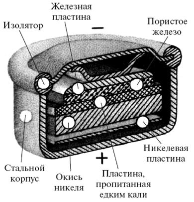 В аккумуляторах Эдисона электролитом служит уже не кислота, а щелочь – 20%-ный раствор едкого кали. Пластины изготовлены из стальных решеток с карманами. У положительных пластин карманы заполнены смесью, содержащей окись никеля, а у отрицательных – губчатым кадмием. Корпус щелочного аккумулятора стальной, что придает устройству большую прочность.