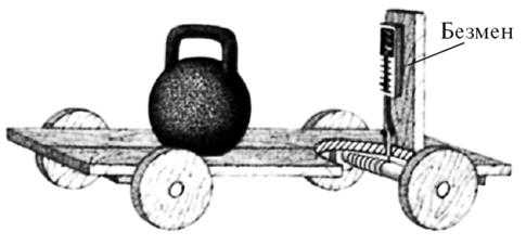 На глаза мне попались пружинные весы, или безмен. «Что, если попробовать сделать тележку, движущуюся под действием энергии, накопленной в безмене?» – подумал я. И, увлеченный этой идеей, тут же принялся за постройку «безменовоза». На простой платформочке с двумя осями и колесами я укрепил безмен, к крючку которого привязал прочную нить. Другой конец нити привязал к одной из осей и, вращая колеса, стал наматывать нить на ось. Чем больший вес показывала стрелка безмена, тем труднее становилось крутить колеса. Это накопленная в пружине механическая энергия стремилась провернуть их в обратную сторону. Растянув пружину на полную длину (у обычных хозяйственных безменов это соответствует 10 кг,
