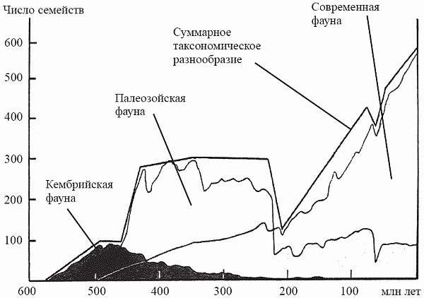 Итак, мы расстались с вендскими экосистемами в то время, когда они пребывали в состоянии глубочайшего глобального кризиса (глава 6). «Эдиакарский эксперимент» окончился неудачей, и эти загадочные крупноразмерные существа исчезли с лица Земли, не оставив после себя прямых потомков. Фитопланктонный кризис погубил все огромное разнообразие тогдашних акритарх; уцелели лишь немногие, причем морфологически однотипные, формы. В необратимый упадок пришли и бентосные сообщества прокариот-строматолитообразователей; отныне они будут занимать в биосфере подчиненное положение. Хотя тогда появились и некоторые новые группы животных (например, сабеллидитиды, строившие органические трубки), конец венда – это время, когда суммарное разнообразие живых организмов на нашей планете падает до рекордно низкого уровня (рис. 23). И подобно тому, как на развалинах одряхлевшей империи возникает государство молодых энергичных «варваров», на смену докембрийской, прокариотной в своей основе, биосфере стремительно приходит современная, фанерозойская.