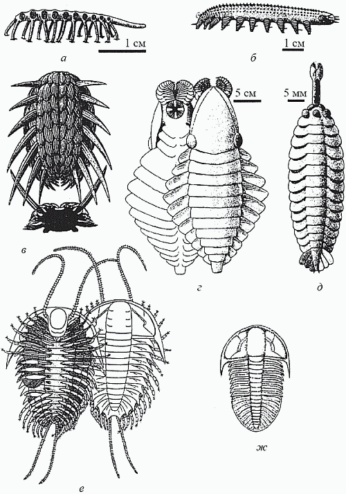 Надо заметить, что мир первых скелетных организмов, сложившийся в начале кембрия (немакитдалдынский ярус), был крайне своеобразен и в чистом виде просуществовал очень недолго, лишь до середины этого периода, хотя отдельные его представители дожили до середины ордовика. В это время уже существовали достаточно многочисленные животные, имевшие раковины (моллюски и брахиоподы) и жилые трубки (сабеллидиты, хиолиты); разнообразнейшие мелкие зубчики (конодонты) представляли собой части ротовых органов древнейших вторичноротых – щетинкочелюстных и хордовых. Весьма характерны для этого мира приапулиды (в современных морях эта реликтовая группа насчитывает лишь 20 видов), а также лобоподы (представленные ныне микроскопическими тихоходками и обитающими в подстилке влажных тропических лесов онихофорами); видимо, именно к лобоподам принадлежат многие загадочные кембрийские организмы вроде галлюцигении. Имелись и многочисленные артроподоподобные формы (рис. 24, а–д).