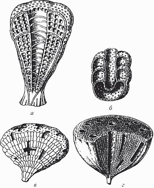 Основу тогдашних экосистем, однако, составляли водоросли, строившие небольшие известковые постройки – биогермы, и чрезвычайно любопытная (как считалось, вымершая) группа организмов – археоциаты. Археоциаты (по-гречески – «древние кубки») похожи на небольшие бокалы (кубки) с двуслойной стенкой (рис. 25); образ жизни – прикрепленный; диаметр колеблется от нескольких миллиметров до нескольких сантиметров, хотя в Сибири найдены и исполинские формы размером до 1,5 м. Природа их долго вызывала споры (неясно было даже, животные это или растения, или вообще отдельное царство), однако в последнее время почти все исследователи согласны с тем, что их следует относить к губкам. Они считались вымершими в середине кембрия, но недавно в Тихом океане была найдена странная глубоководная губка Vacletia, оказавшаяся по рассмотрении дожившим до наших дней археоциатом и пополнившая собой галерею «живых ископаемых» (вроде кистеперой рыбы или гинкго).
