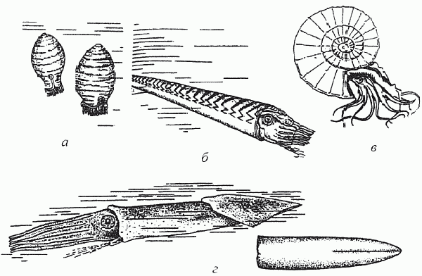 И вновь головоногие нашли выход: с этого времени начинается расцвет групп, имеющих внутреннюю раковину, – белемнитов и происходящих от них кальмаров. Вообще-то белемниты появились еще в карбоне, но до сих пор они пребывали на вторых ролях. Теперь же, когда возможности пассивной защиты оказались исчерпаны, стратегия белемнитов – отказ от раковины в обмен на увеличение скорости передвижения – оказывается генеральной линией эволюции головоногих. Судя по всему, внутреннераковинные головоногие оказались самыми скоростными обитателями мезозойского океана. Им не пришлось решать проблему устойчивости в движении, как прямым головоногим (см. выше), поскольку их тело, лишенное раковины, способно выравнивать «полет» при помощи плавников-стабилизаторов (рис. 27, г). Отсутствие таких ограничителей роста, как твердые покровы членистоногих, позволяет им достигать очень крупных размеров. Современный гигантский кальмар достигает в длину 18 м (со щупальцами) и является самым крупным беспозвоночным (на коже китов находили отпечатки присосок кальмаров, длина которых оценивается в 30 м), а ведь в прошлом вполне могли существовать и более крупные виды! Как бы то ни было, внутреннераковинные головоногие успешно дожили до наших дней и вымирать явно не собираются. Достаточно сказать, что в пробах грунта из глубоководных частей Тихого океана число челюстей кальмаров на один квадратный метр варьирует от нескольких десятков до нескольких сотен, что дает некоторое представление о численности (и экологической роли) этих животных в современных морях.