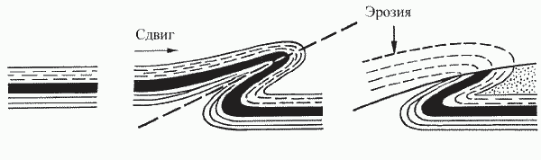 Принципы эти, казалось бы, предельно просты, однако при их практическом применении нас подстерегает целый ряд ловушек. Так, исходная последовательность слоев в результате тектонических движений зачастую сминается в более или менее горизонтальные складки. Если в дальнейшем вышележащая половинка складки (с «правильной» последовательностью) окажется полностью уничтоженной эрозией, то установить, что в нашем распоряжении осталось лишь искаженное, запрокинутое залегание слоев, будет весьма непросто (рис. 1, б).
