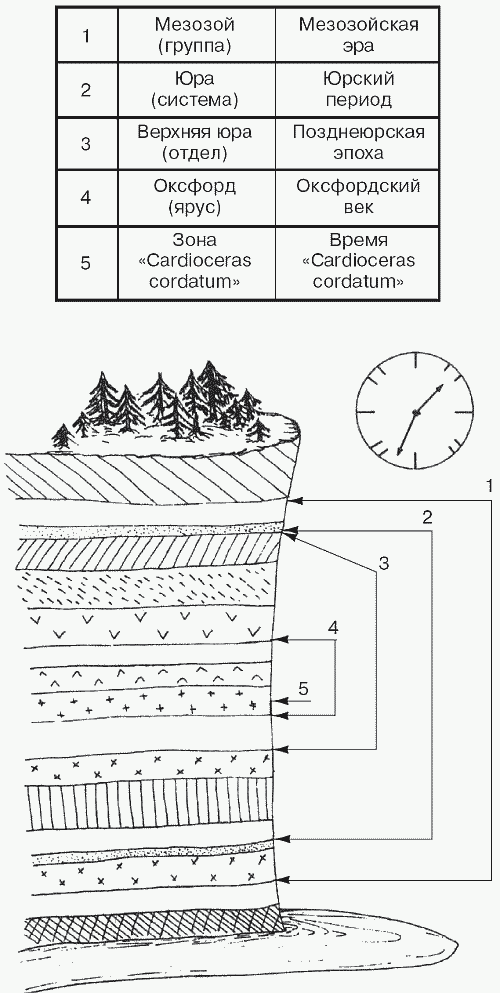 С каждой из единиц, составляющих существующую последовательность осадочных пород, можно однозначно соотнести определенное подразделение временно?й шкалы – и наоборот; так, все отложения, образовавшиеся на Земле на протяжении юрского периода, образуют юрскую систему, или просто юру. Системы объединяются в группы (юра входит в состав мезозоя) и делятся на отделы (нижняя, средняя и верхняя юра), ярусы (верхняя юра – на келловей, оксфорд, кимеридж и титон), а далее на зоны (Cardioceras cordatum). Временны?м эквивалентом группы является эра, отдела – эпоха, яруса – век, зоны – время (рис. 3).