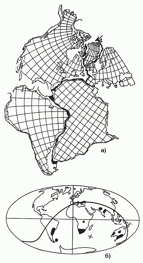 Но ничего лучшего в распоряжении геологов не было до 1912 года, когда А. Вегенер предложил свою теорию дрейфа континентов (т.е. их горизонтальных перемещений), объяснявшую с единых позиций целый ряд явлений, в том числе процесс орогенеза. Отправным пунктом в построениях Вегенера было удивительное сходство береговых линий континентов по разные стороны Атлантического океана (рис. 5, а), на которое обращали внимание многие естествоиспытатели еще с XVII века (Ф. Бэкон). Вегенер не довольствовался совмещением контуров всех приатлантических и – в несколько меньшей степени – прииндоокеанских континентов (подобно кусочкам мозаики, формирующим единое панно). Он показал практически полную идентичность позднепалеозойских и раннемезозойских геологических разрезов Африки и Южной Америки, находящихся ныне по разные стороны Южной Атлантики, и очень высокое единство позднепалеозойской флоры и фауны всех разделенных теперь океанами материков Южного полушария и Индии. Это привело его к выводу о том, что в конце палеозоя все материки были собраны в единый протоконтинент – Пангею, состоящий из двух блоков: северного, Лавразии (Северная Америка и Евразия без Индостана), и южного, Гондваны (Южная Америка, Африка, Индостан, Австралия и Антарктида), разделенных морем Тетис. Пангея была окружена единственным же – огромным – океаном; таких океанов, как Атлантический и Индийский, в то время еще не существовало.