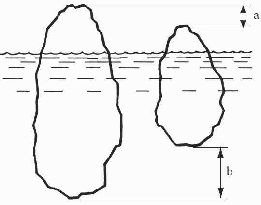 Из всего этого был сделан совершенно правильный вывод о том, что породы коры легче пород мантии и «плавают» в ней подобно айсбергам (или как металлические пластины в ванне со ртутью). Плавающий айсберг, в соответствии с законом Архимеда, должен быть глубоко (на 5/6 своего объема) погружен в воду; чем выше его надводная часть, тем больше должна быть подводная (рис. 6). На дне океанов слой коры очень тонок, тогда как материки сформированы во много раз более толстой и более легкой корой (в 50-е годы ХХ века это было подтверждено прямыми измерениями – средняя толщина континентальной и океанической коры составляет 36 и 7,5 км, соответственно); максимальной же толщины кора достигает под горными системами («У гор глубокие корни»). Это явление было названо изостатическим равновесием, или просто изостазией – взаимное уравновешивание по закону Архимеда, когда вес погруженного тела (коры) равен весу вытесненной им жидкости (мантийного вещества). Необходимо помнить, что «жидкость», в которую погружена кора, обладает столь большой вязкостью, что при относительно быстрых (сотни – первые тысячи лет) нагрузках ведет себя как твердое тело.