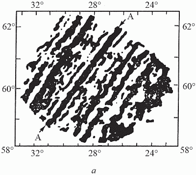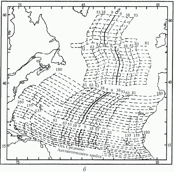 Понятно, что образующиеся в рифтовых зонах породы океанической коры при своем остывании в соответствующие эпохи полярности тоже должны были приобретать, соответственно, нормальную или обратную намагниченность. Как выяснилось, эту намагниченность можно измерять прямо с океанской поверхности, не прибегая к анализу самого донного вещества. В 1963-64 годах независимо друг от друга Л. Морли, Ф. Вейн и Д. Мэтьюз пришли к выводу о том, что при спрединге океанического дна на нем должны образовываться полосы положительных и отрицательных магнитных аномалий, параллельные срединно-океаническим хребтам и симметричные относительно них; при этом ширина таких полос должна быть пропорциональна длительности соответствующих эпох полярности. Это предположение полностью подтвердилось (рис. 9, а). Тогда же родилась еще одна аналогия: океаническое дно – это магнитофонная лента, на которой записана история магнитного поля Земли.