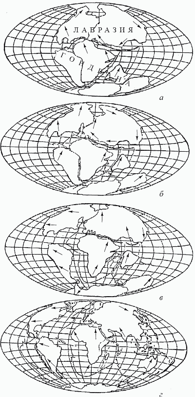 Спрединг океанического дна – это один из «китов», на которых стоит господствующая ныне в геологии концепция тектоники литосферных плит. Из многих ее аспектов нас будет интересовать лишь рисуемая ею картина перемещения и взаиморасположения континентов в различные периоды прошлого, ибо именно эти перемещения в значительной степени определяют характер климата соответствующей эпохи. Глядя на реконструкции (рис. 10), мы видим, что материки могут «слипаться» в обширные континентальные массы (Гондвана, Пангея), которые затем раскалываются на отдельные фрагменты и вновь сталкиваются между собой (Азия и Индостан). Возникает естественный вопрос: является ли это движение бессистемным, «броуновским», или оно определяется некими закономерностями? И здесь нам придется вернуться к упомянутому выше процессу мантийной конвекции.