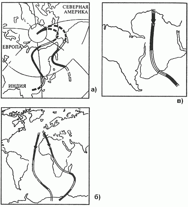 В результате этих исследований выяснились две вещи. Во-первых, теперь было прямо доказано, что все «Гондванские» материки действительно находились некогда в гораздо более высоких широтах Южного полушария, чем ныне. Во-вторых, общая картина положения полюсов в геологическом прошлом получалась какая-то странная. Данные по каждому отдельному материку «рисуют» вполне согласованную траекторию перемещений полюсов (например, Северный полюс относительно Евразии начиная с карбона двигался из центральной части Тихого океана до своего нынешнего положения по S-образной кривой, проходящей через Берингов пролив), однако траектории, даваемые разными материками, не совпадают между собой – за исключением того, что все они заканчиваются близ современного полюса (рис. 7, а