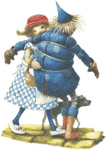 Вскоре дорога стала не такой ровной и гладкой, как раньше. Идти было трудно, и Страшила постоянно спотыкался на выбоинах. Время от времени на пути попадались ямы. Тото перепрыгивал через них, а Дороти аккуратно обходила. Поскольку у Страшилы вместо мозгов была солома, он шёл напрямик, частенько терял равновесие и падал плашмя. Однако он не ушибался. Дороти помогала ему подняться на ноги, и он первый смеялся над своими неудачами.