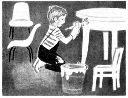 Стали красить низенькую мебель. А это тоже замечательное дело. Ведь каждому стулу, даже самому маленькому, нужно покрасить четыре ноги, четыре перекладины, и донышко, и спинку!