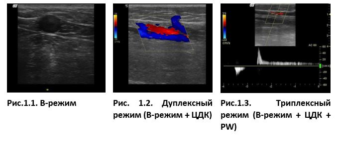 Ультразвуковое ангиосканирование позволяет одновременно визуализировать вену в режиме серой шкалы (так называемый B-режим, рис. 1.1) и окрашивать кровоток в зависимости от его направления и скорости (так называемое цветное допплеровское картирование, обозначается обычно буквами ЦДК или CF – color flow). Одновременное использование этих двух режимов называется дуплексным сканированием (рис. 1.2). Если же к ним присоединяется импульсный допплеровской режим (обозначается обычно буквами PW), такое ангиосканирование называют триплексным (рис. 1.3). Иногда используется так называемый энергетический допплер, который окрашивает все движущиеся частицы крови в один цвет (как правило, оранжевый), вне зависимости от