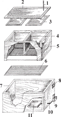 Маточный инкубатор: 1 – термометр; 2 – крышка; 3 – потолочины; 4 – разделительная сетка; 5 – внутренний корпус; 6 – нагревательные элементы; 7 – наружный корпус; 8 – регулятор температуры; 9 – резервуар; 10 – соединительный шланг; 11 – кювета