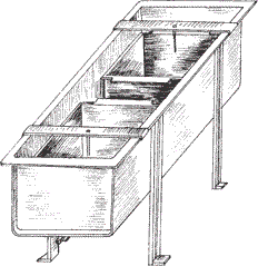 Это приспособление для срезания забруса, которое ускоряет откачку меда. Оно представляет собой бак, расположенный на раме, который сделан из нержавеющей стали. У него есть сливной патрубок и кран. В бак вставляют алюминиевые кассеты с сетчатым дном (каждая на 15 рамок с сотами). Рамки фиксируются двумя поперечинами с иглами. Вначале закрепленные на иглах соты распечатывают пасечными ножами, потом снимают забрус. После этого соты убирают. Срезанный забрус собирается в кассетах, из него вытекает мед на дно бака, а потом – через кран в подготовленную тару. Вынутые из кассет срезки сотов центрифугируют, чтобы отделить от них остатки меда. Перед началом работы и после нее стол для распечатывания сотов моют горячей водой и высушивают.