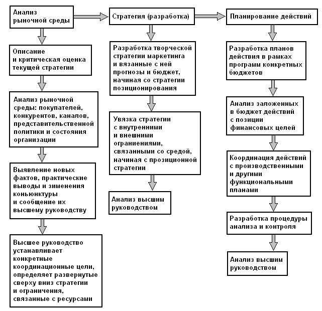 Жирные стрелки указывают направление процесса подготовки и составления годового плана маркетинга. Чтобы не усложнять рисунок, на нем не показаны: петли обратной связи и переработка принятых решений, которые происходят в результате анализа, проведенного высшими управляющими, а также проблемы, связанные с планированием действий.