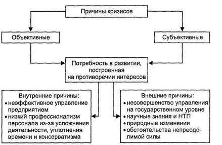 Причины кризиса могут быть различными: объективные, связанные с циклическими потребностями модернизации и реструктуризации, и субъективные, порожденные ошибками и недостатками в управлении (рисунок 1.4).