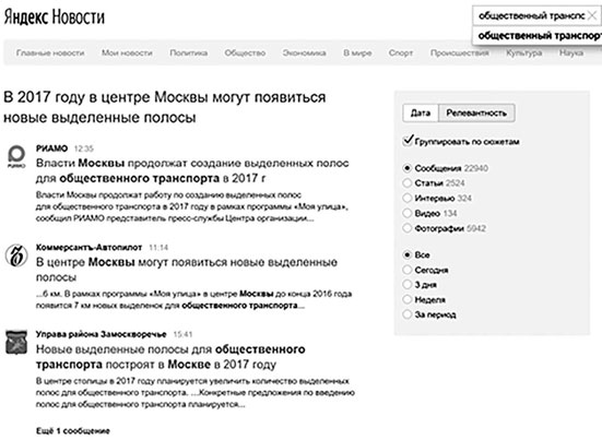 В остальном сервис работает как поисковик «Яндекс». Справа от поисковой выдачи есть набор дополнительных фильтров для выделения особо интересующих групп источников.
