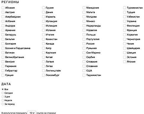 Можно искать сообщения по конкретным рубрикам, а также выбирать конкретные сайты-источники интересующих упоминаний, то есть настроить поиск так, чтобы новости отыскивались только на заданных новостных сайтах. Присутствует настройка поиска по конкретным регионам-государствам и ограничение по датам.