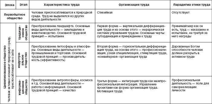 С наступлением эпохи цивилизации (эпоха динамичного развития человечества, характеризующаяся активной деятельностью человека по изменению окружающей среды, – V–IV тысячелетие до н. э.) и ее первого этапа – традиционного общества человек оказался «проклят на труд» (историческая смена характера трудовой деятельности представлена в табл. 5.1). Первой формой дифференциации труда явилась вертикальная – на ее основе возникли иерархическая система управления трудом, субординация (подчинение) и принуждение к труду. Функции работников, стоящих на разных уровнях иерархии, были различными: руководители отдавали распоряжения, подчиненные выполняли эти распоряжения. Но работники, стоящие на одном иерархическом уровне, обычно всегда выполняли одни и те же функции и при этом были заменяемы.